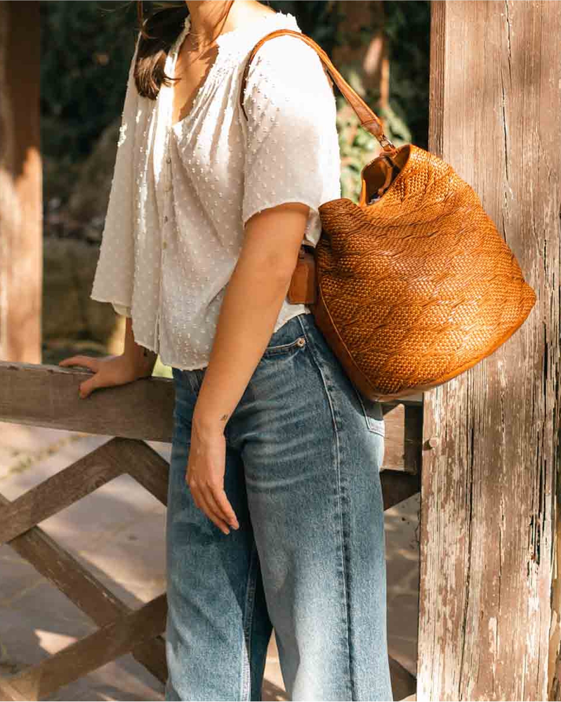 Washed, vegetable-tanned, and hand-braided cowhide leather bucket bag.