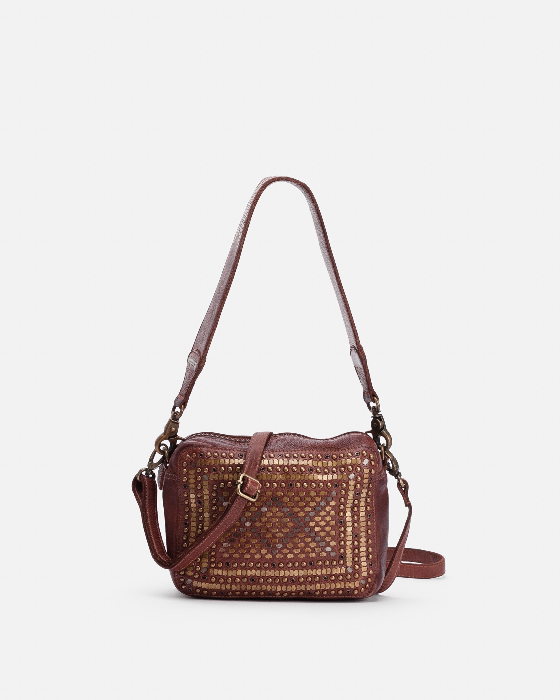 Metallic studs on the front, zip closure, removable handle, adjustable and removable shoulder strap, internal pockets, and cotton lining.