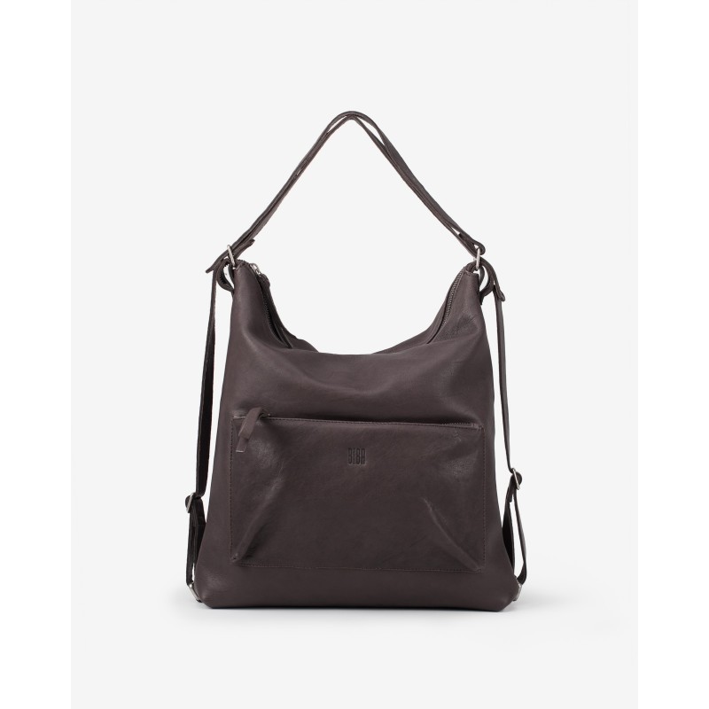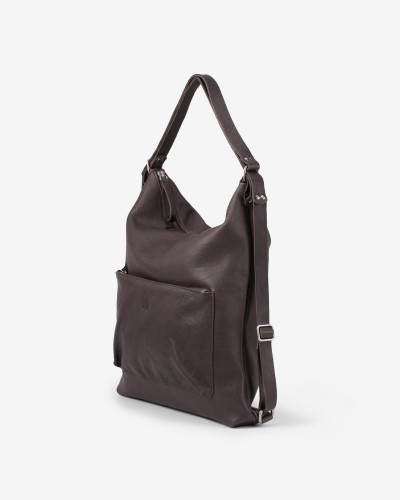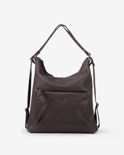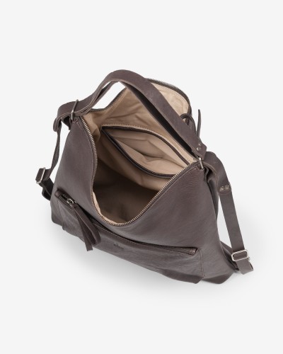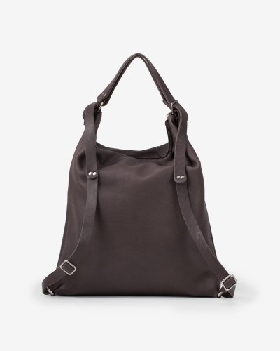 皮革背包,可轉換為單肩包。可調式皮革提把。拉鍊開合。正面(或背面)有拉鍊口袋。