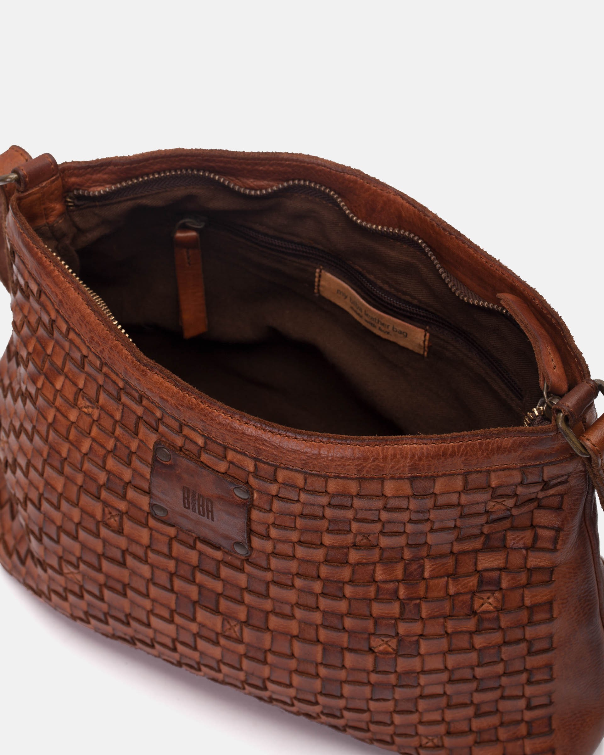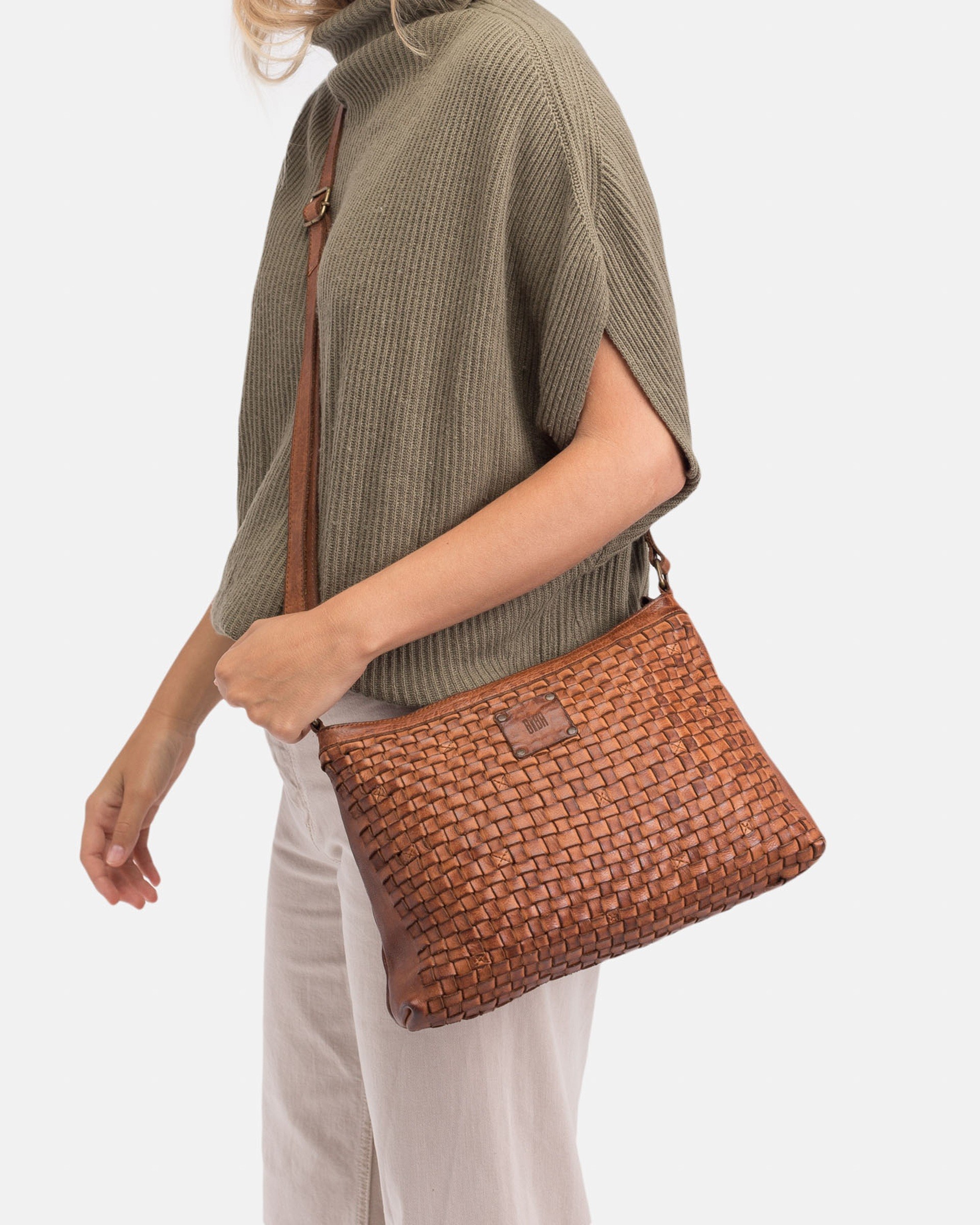 水洗牛皮、植物鞣製和手工編織的斜背包。