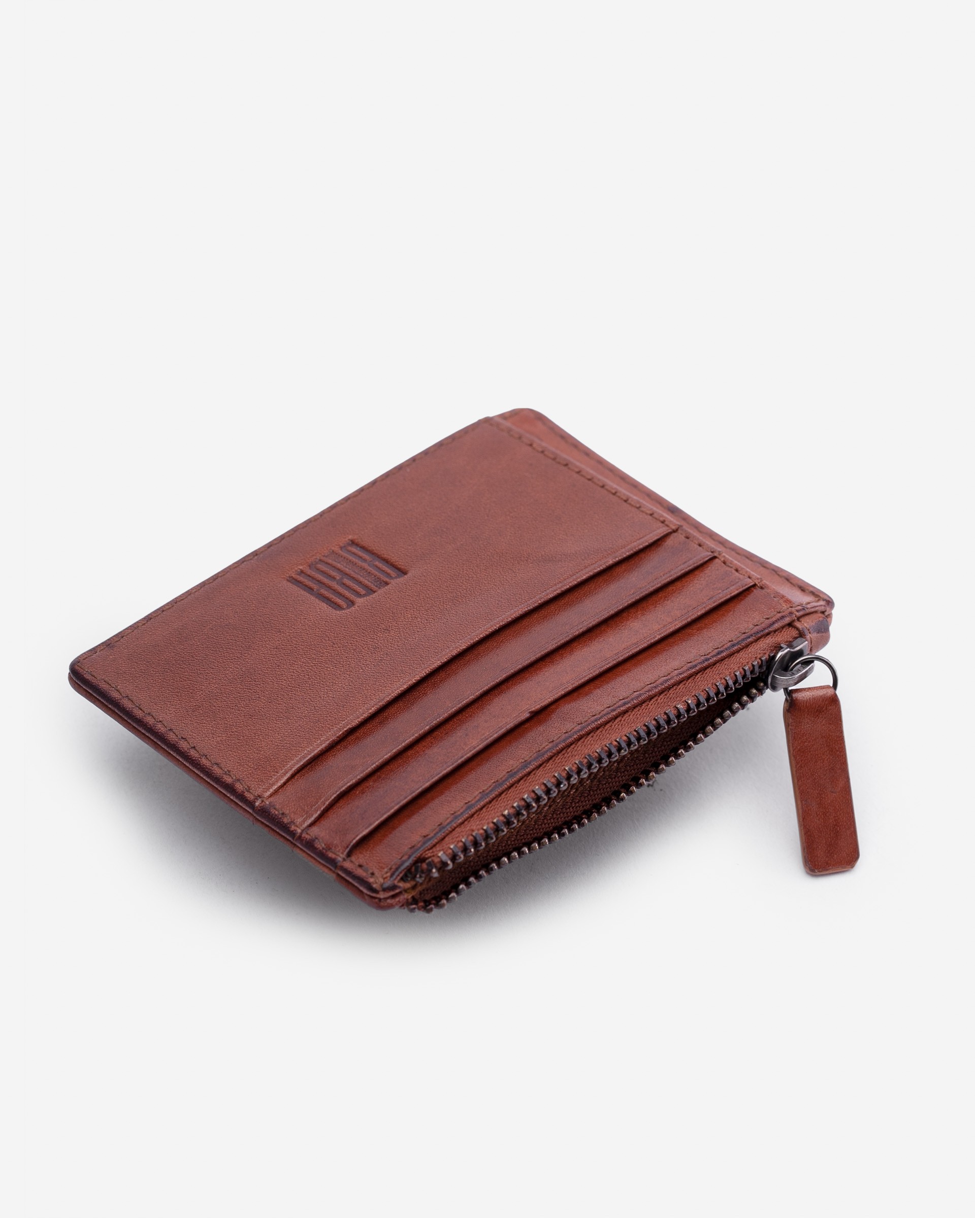 天然皮革卡夾,正面有縫線細節。