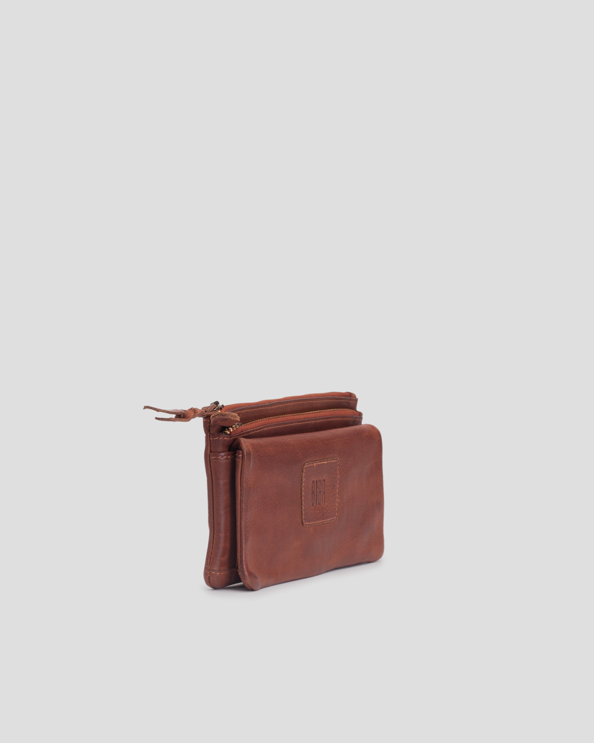 Flap-button closure, zips and compartments for cards, bills and coins.