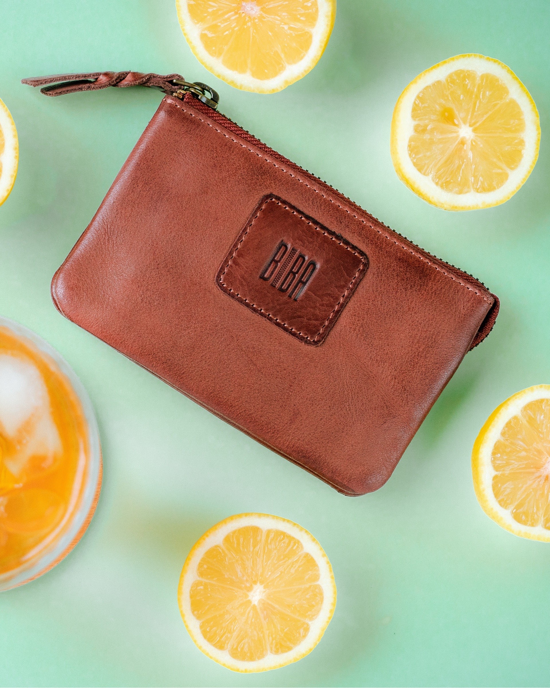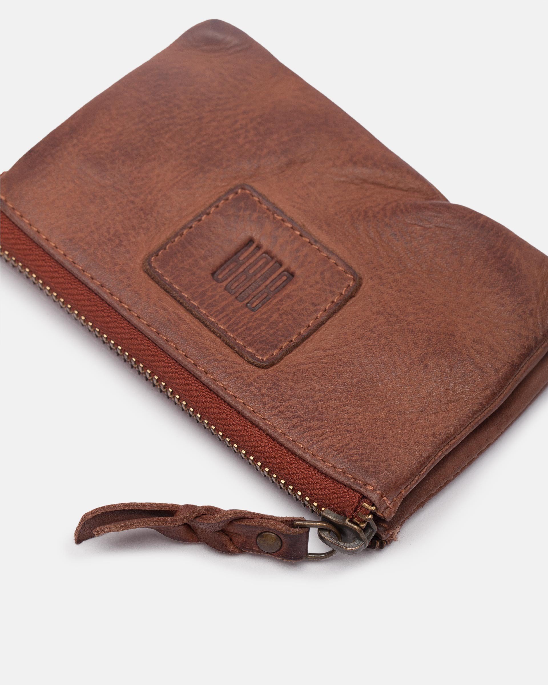 Washed, and vegetable-tanned cowhide multiple zip wallet.