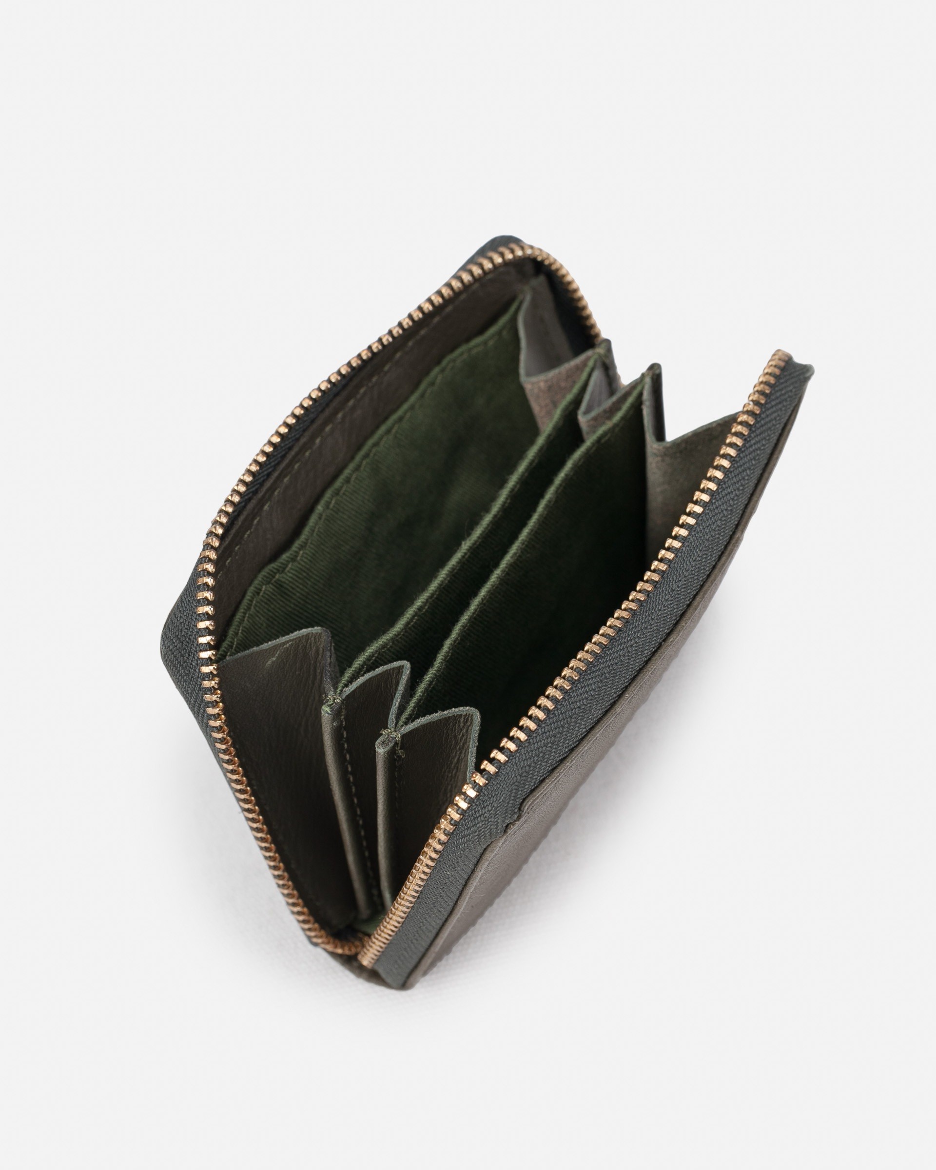 水洗植鞣牛皮小钱包/咭片夹。拉链开合,卡位设计。