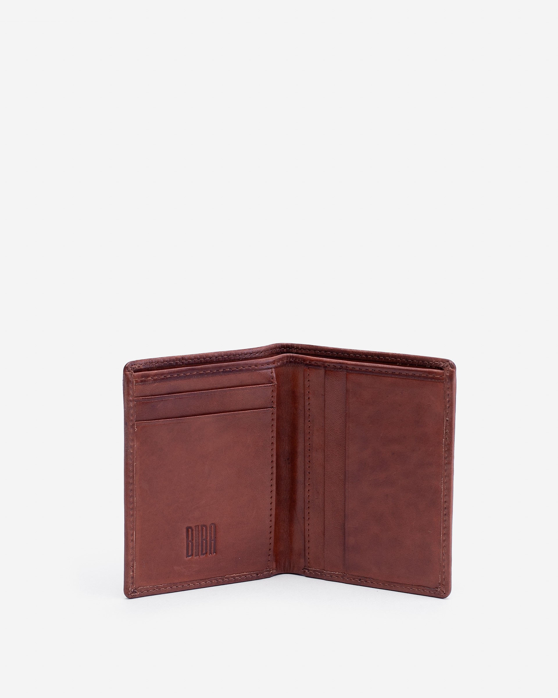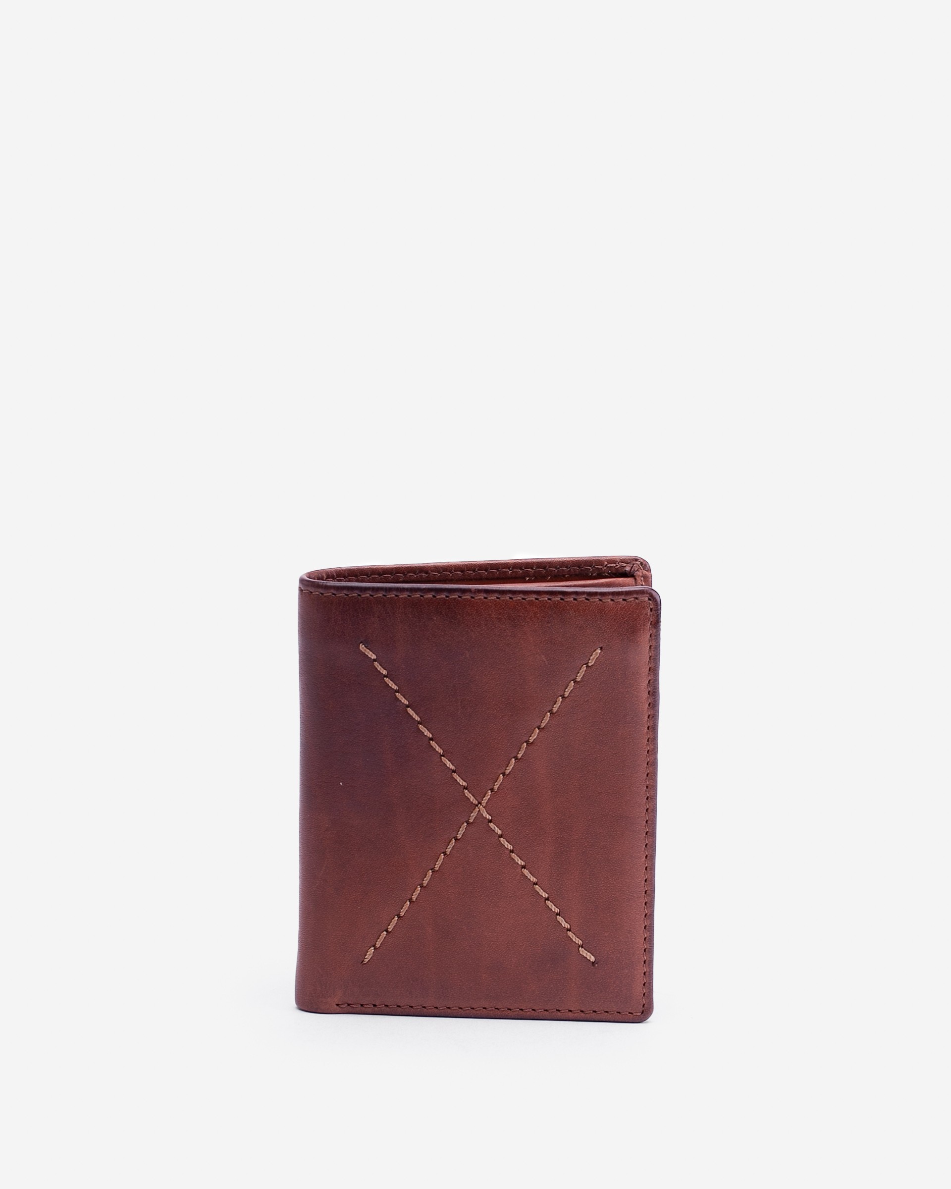 天然皮革竖款钱包,正面有缝线细节。